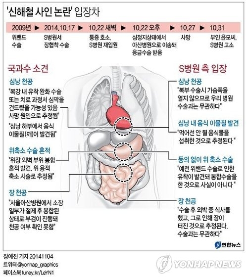 S병원측 담당 변호사는 4일 연합뉴스와의 통화에서 “신씨의 심낭(심장을 싸고 있는 이중막)에 천공이 생겼다는 것은 저희측 복부 수술과 무관하다”고 말했다.
