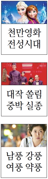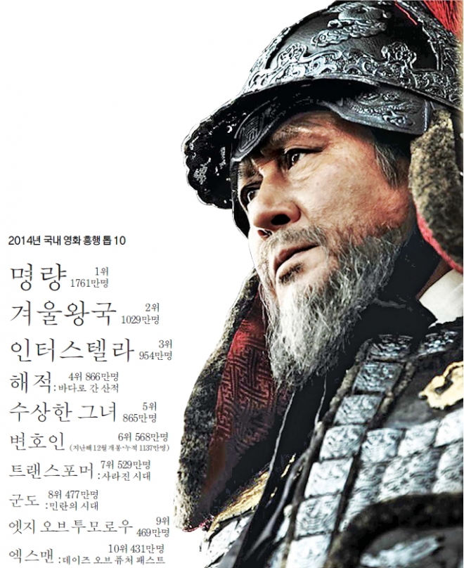 2014년 영화계는 무려 3편의 천만 영화를 내놓으며 식지 않는 영화 열기를 확인한 한 해였다. 1월 ‘변호인’이 새해 첫 1000만 영화 신호탄을 쏜 데 이어 2월에는 ‘겨울왕국’이 애니메이션 영화 사상 최초로 1000만 관객을 돌파했다. 여름에는 관객 1761만명을 동원한 ‘명량’이 ‘아바타’의 아성을 깨고 역대 국내 영화 1위에 올라서는 기염을 토했다.
