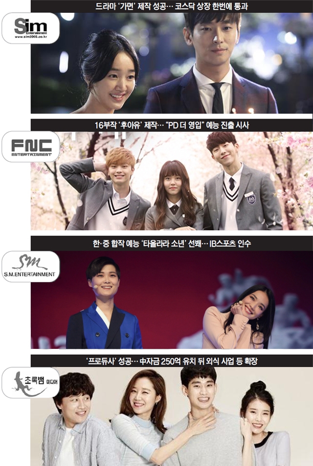 일찌감치 콘텐츠 제작에 뛰어든 가요기획사 SM엔터테인먼트는 자회사인 SM C&C를 통해 현재 방영 중인 KBS 수목 미니시리즈 ‘객주-장사의 신’과 제작비 150억원이 투입된 JTBC 재난 드라마 ‘디데이’를 제작한 데 이어 중국 아이돌 그룹을 육성하는 한·중 합작 예능 프로그램 ‘타올라라 소년’을 통해 중국 예능 제작 진출의 시동을 걸었다. 이 프로그램에는 KBS에서 영입한 이예지 PD가 제작에 참여했다. SM은 올해 스포츠 마케팅 회사 IB스포츠를 인수하면서 IB스포츠 채널까지 자회사로 거느리게 됐다. 드라마 제작뿐만 아니라 김우빈, 장혁의 소속사로 유명한 IHQ는 가요기획사 큐브엔터와 전략적 제휴를 맺은 데 이어 CU미디어와 합병하면서 큐브TV, 코미디TV 등 IHQ 미디어를 운영하고 있다.