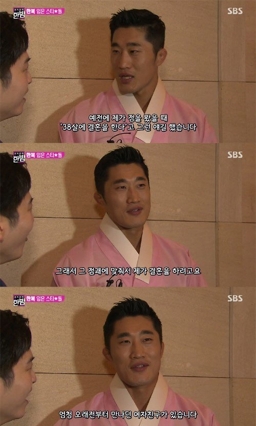 이날 방송에서 김동현은 “예전에점을 본 적이 있다. ‘38살에 결혼을 한다’는 애기를 들었다”며 깜짝 결혼 발표를 했다.