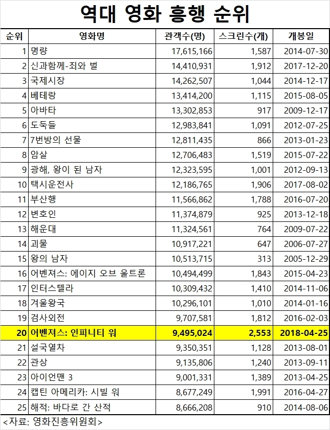 마블 스튜디오가 만든 판타지 대작 ‘어벤져스: 인피니티 워’의 국내관객 수가 1000만명 돌파를 눈앞에 두고 있다. 한국 영화와 해외 영화를 합쳐 역대 20위이며 해외 영화 중에서는 5위의 성적이다.