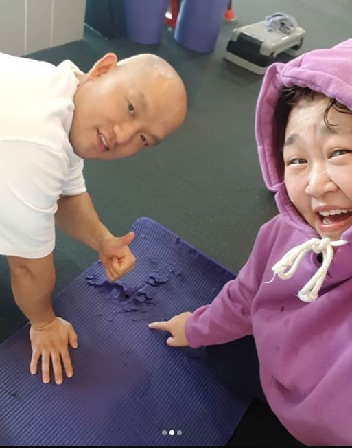 홍윤화는 이날 자신의 인스타그램에 “오늘도 불태우자! 열심히 운동한 매트가 구멍 난 기념으로 송쌤과!”라는 내용의 글과 함께 사진을 올렸다.