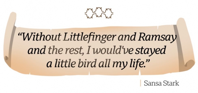 ‘최후에 살아남는 이가 꼭 가장 강한 이는 아니다. 때때로 똑똑한 이가 마지막까지 살아남는다’는 말이 있다. 이 말은 스타크 가문의 맏딸이며 아버지의 잔혹한 처형 장면을 목격한 뒤 정절을 잃고, 나중에 어머니와 오빠들의 비극적인 죽음을 알게 된 산사에게 딱 들어맞는 얘기다.