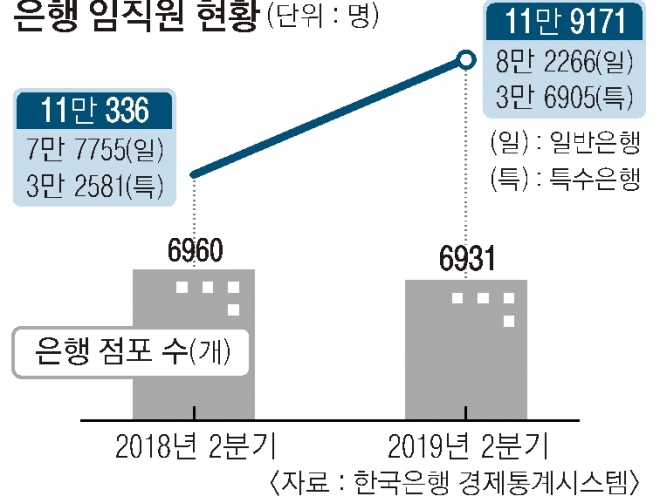 10일 한국은행 경제통계시스템에 따르면 지난 2분기 기준 은행 임직원은 11만 9171명으로 집계됐다. 지난해 2분기 11만 336명에 비해 8.0% 늘었다. 반면 같은 기간 은행 지점은 6960곳에서 6931곳으로 줄었다.