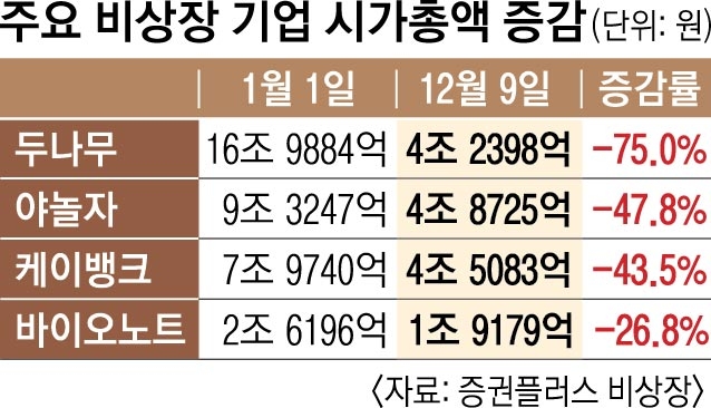 종목별로 보면 지난해 암호화폐 시장 활황에 힘입어 시총이 연초 17조원에 육박했던 두나무는 같은 기간 4조 2398억원으로 75%나 빠졌다. 빗썸코리아 시총도 같은 기간 2조 1153억원에서 3812억원으로 폭락했다.