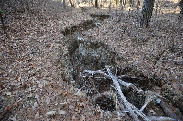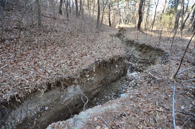 마을에서 조금 떨어진 이 야산 골짜기에는 길이 200m, 깊이 1.5m, 폭 2m에 이르는 땅 꺼짐 현상이 보였다.
