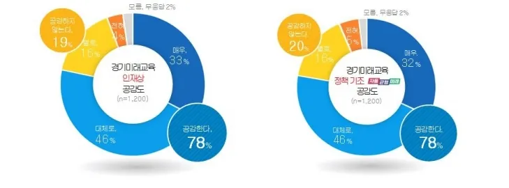 경기미래교육의 기조인 ‘자율, 균형, 미래’에 대해서는 응답자의 78%, 경기교육의 인재상인 ‘인성과 역량을 갖춘 미래인재’에 대해선 78%가 공감한다고 답했다.