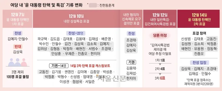 전날 상설특검 자율 표결에서 나온 국민의힘의 찬성 22표, 기권 14표의 향방도 탄핵안 표결의 변수로 꼽힌다. 찬성 22명 중 김용태·김재섭·박수민·배준영 의원을 제외한 18명은 모두 친한(친한동훈)계다. 원내수석부대표인 배 의원은 원내지도부로 모신 추경호 전 원내대표가 수사 대상으로 포함된 상설특검에 찬성한 이유에 대해 “소신대로 투표했다”고 밝혔다.
