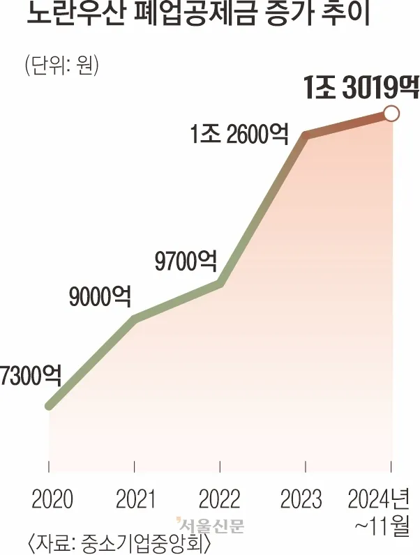 코로나19 이후 삶의 동력을 회복하지 못한 자영업자들의 삶이 부서지고 있다. 폐업 소상공인을 지원하는 노란우산 폐업공제금은 올 들어 11월까지 1조 3019억원 지급되며 사상 최대를 기록했다. 소상공인의 은행 빚을 대신 갚아 주는 신용보증재단 대위변제금은 2022년 5076억원에서 올 들어 10월까지 2조 578억원으로 4배 가까이 급증했다.