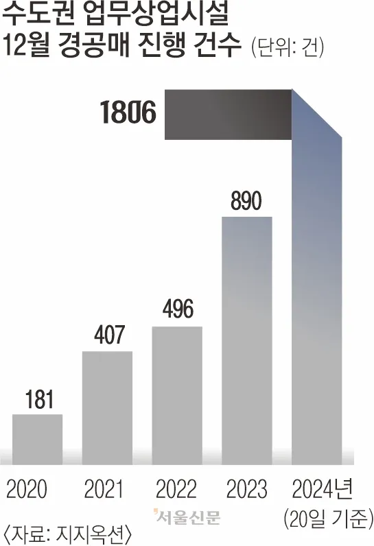 텅 빈 상가는 늘어만 간다. 2분기 8.01%로 역대 최고를 기록했던 전국 소규모 상가 공실률은 3분기 소폭 하락했지만 정부의 대출 규제 직전 반짝 타올랐던 부동산 경기 영향일 뿐 계엄 쇼크가 있는 4분기는 악화할 것이 확실시된다. 부동산 경공매 데이터 전문기업 지지옥션에 따르면 올해 12월(20일 기준) 경공매 절차에 들어간 수도권 상가는 1806곳으로 팬데믹이 본격화한 2020년 같은 기간에 비해 10배 가까이 늘었다.