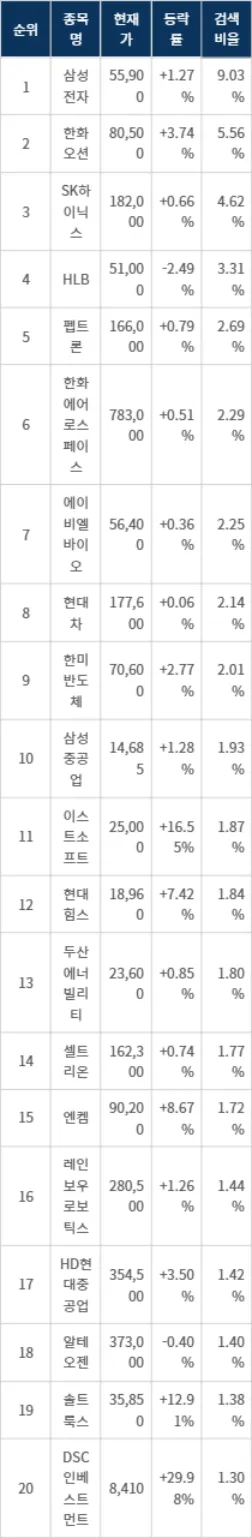 이어 한화오션(042660)이 검색비율 2위를 기록하며 3.74%의 상승세를 기록하고 있다. 검색비율 3위의 SK하이닉스(000660)는 0.66% 상승하며 순조롭게 출발하는 모습이다. 검색비율 4위 HLB(028300)는 개장 초반부터 -2.49%의 하락률로 다소 약세를 보이고 있다. 검색비율 5위 펩트론(087010)은 0.79% 상승하며 큰 움직임을 보이지 않고 있다.