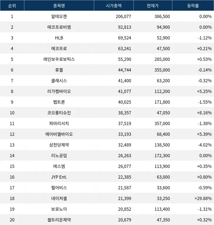 22일 한국거래소에 따르면, 시가총액 1위 알테오젠(196170)(액면가 500원)은 현재가 386,500원으로 전 거래일 대비 변동이 없으며 보합세를 이어가고 있다. 상장주식수 53,319주에 외국인비율이 15.12%에 달하는 이 종목은 PER 330.06, ROE 29.52로, 수급 측면에서는 안정적이나 재무 지표에서는 높은 PER이 눈에 띈다. 2위 에코프로비엠(247540)(액면가 500원)도 94,900원으로 보합세를 유지하고 있으며, 거래량은 132,717주를 기록하고 있다. 외국인비율 10.74%를 보이며, PER -96.15, ROE -6.26으로 재무 지표는 부정적인 상황이다.