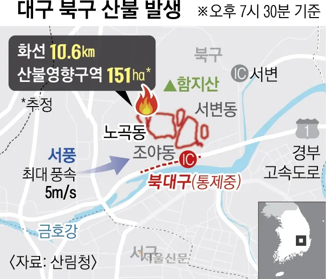 대구 관문인 북대구IC 인근 함지산에서 발생한 산불이 강풍을 타고 빠르게 확산해 산불 대응 3단계가 발령됐다. 소방청은 국가 소방동원령까지 내리고 저지에 나섰다.