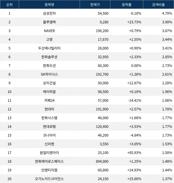 이어 블루엠텍(439580)이 검색비율 2위를 기록하며 23.73%의 폭등세를 기록하고 있다. 검색비율 3위의 NAVER(035420)는 0.79% 상승하며 순조롭게 출발하는 모습이다. 검색비율 4위 고영(098460)은 개장 초반부터 1.55%의 상승률을 보이고 있다. 검색비율 5위 두산에너빌리티(034020)는 0.90% 상승하며 큰 움직임을 보이지 않고 있다.