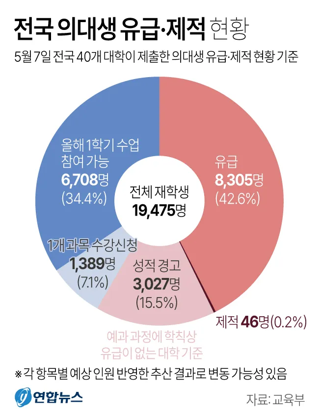 교육부가 지난 9일 발표한 의대생 유급·제적 대상자 현황을 보면 전국 40개 의대 재학생(1만 9475명)의 42.6%인 8305명이 유급 대상자로 확정됐다. 제적 대상자는 46명(0.2%)이다.