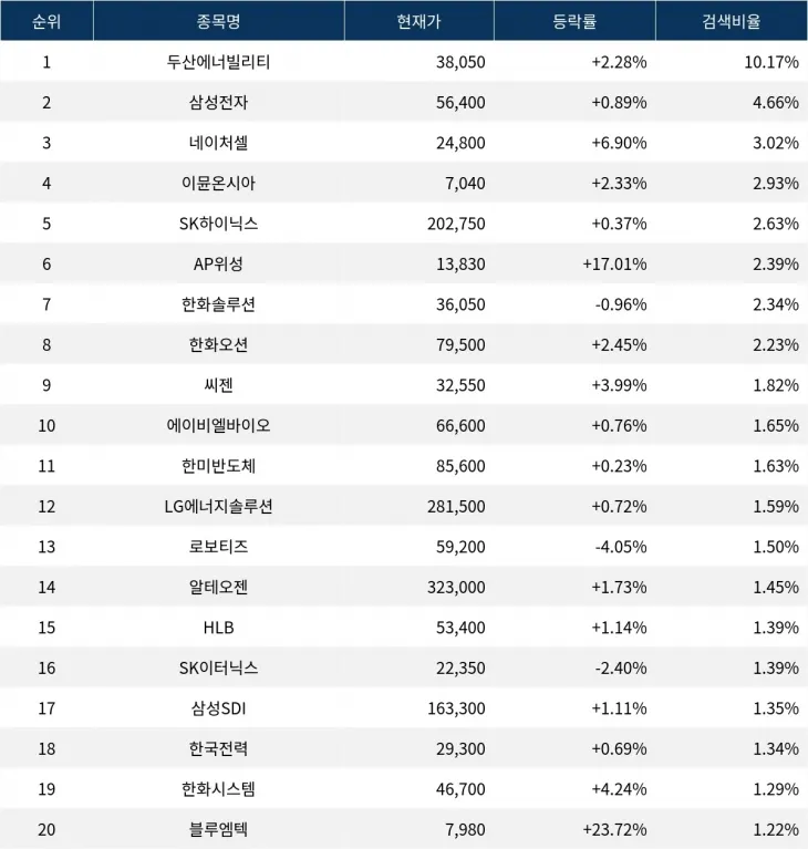 이밖에도 블루엠텍(439580) ▲23.72%, 한화시스템(272210) ▲4.24%, 알테오젠(196170) ▲1.73%, HLB(028300) ▲1.14%, 삼성SDI(006400) ▲1.11% 등이 많이 검색되고 있다.