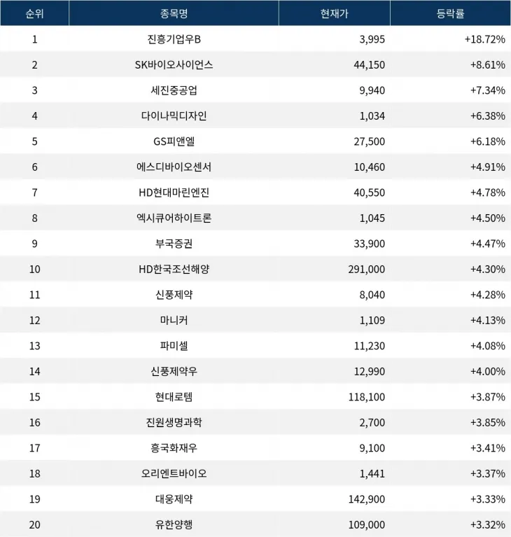 이어 상승률 2위 SK바이오사이언스(302440)는 현재가 44,150원으로 주가가 8.61% 상승하고 있다. 상승률 3위 세진중공업(075580)은 현재 9,940원으로 7.34% 상승하며 견고한 모습을 보이고 있다. 상승률 4위 다이나믹디자인(145210)은 6.38% 상승하며 1,034원에 거래되고 있다. 상승률 5위 GS피앤엘(499790)은 6.18%의 상승세를 타고 27,500원에 거래되고 있다.