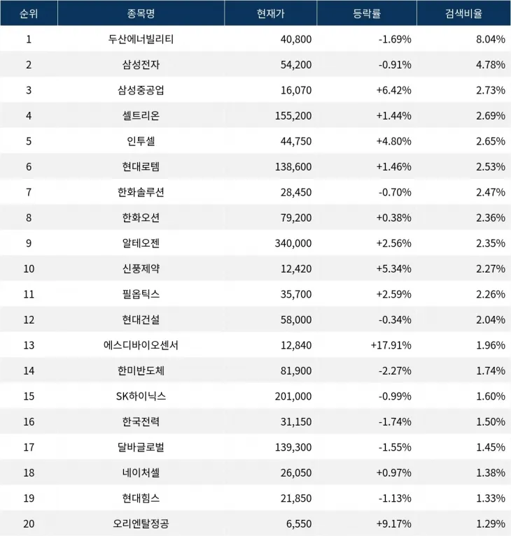 이어 삼성전자(005930)가 검색비율 2위를 기록하며 0.91%의 하락세를 보이고 있다. 검색비율 3위의 삼성중공업(010140)은 6.42% 상승하며 순조롭게 출발하는 모습이다. 검색비율 4위 셀트리온(068270)은 개장 초반부터 1.44%의 상승률을 기록하고 있다. 검색비율 5위 인투셀(287840)은 4.80% 상승하며 긍정적인 움직임을 보이고 있다.