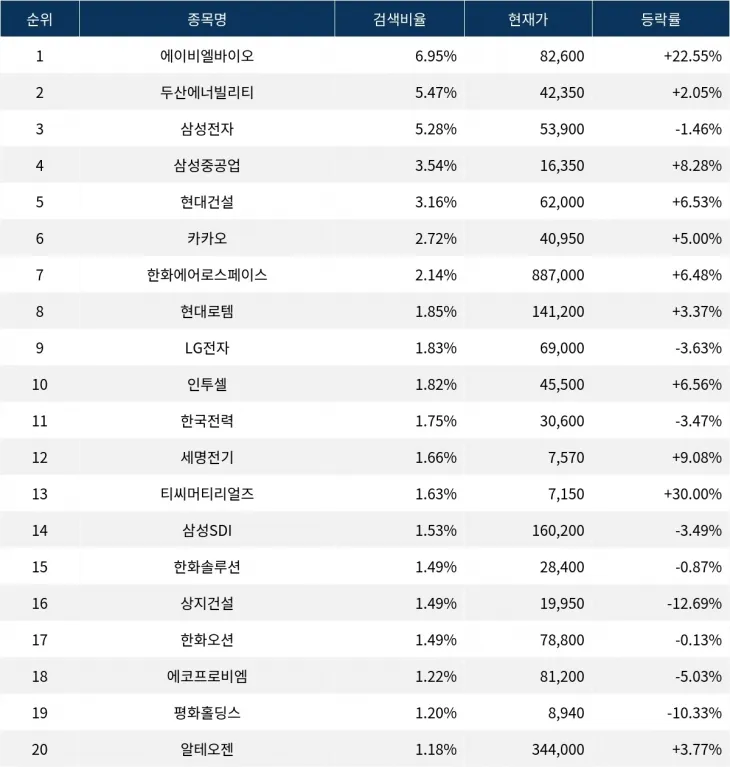 이어 검색비율 2위의 두산에너빌리티(034020)는 상승률 2.05%로 거래를 마쳤다. 검색비율 3위의 삼성전자(005930)는 1.46% 하락 마감했다. 검색비율 4위 삼성중공업(010140)은 상승률 8.28%로 상승 마감했다. 검색비율 5위 현대건설(000720)은 6.53% 상승하며 거래를 마쳤다.