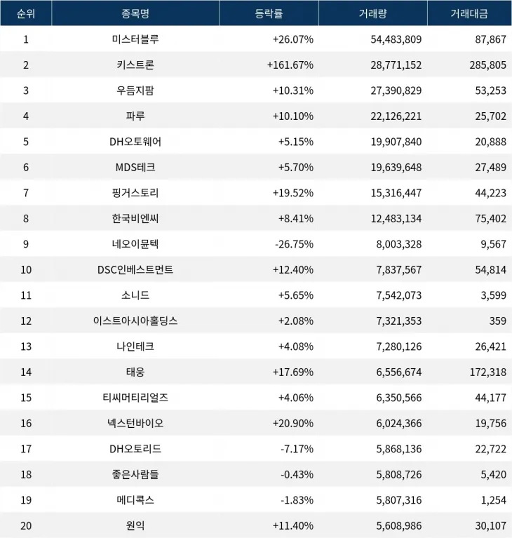 2일 한국거래소에 따르면, 미스터블루(207760)가 5천만주 이상의 거래량을 기록하며 코스닥 종목 중 거래량 1위를 차지한다. 현재 주가는 1,673원으로, 거래대금은 878억 6,700만원에 이른다. 시가총액 대비 거래대금 비율은 약 63.22%에 달하며, 이는 시장에서의 상당한 매수·매도 공방을 시사한다. 키스트론(475430)은 2위를 기록하며 거래량 28,771,152주, 현재가는 9,420원이다. 거래대금은 2,858억 500만원으로, 시가총액 대비 거래대금 비율이 약 170%에 달한다. 해당 종목은 급등세를 보이며 투자자들의 관심을 끌고 있다.