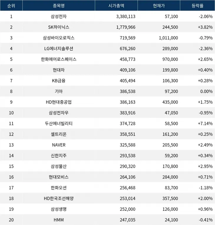 한편 시가총액 20위권 종목들은 두산에너빌리티(034020) ▲7.14%, 셀트리온(068270) ▲0.25%, NAVER(035420) ▲2.49%, 신한지주(055550) ▲0.34%, 삼성물산(028260) ▲2.95%, 현대모비스(012330) ▲0.71%, 한화오션(042660) ▼1.18%, HD한국조선해양(009540) ▲2.00%, 삼성생명(032830) ▲0.96%, HMM(011200) ▼0.41% 등의 성적을 기록하고 있다.