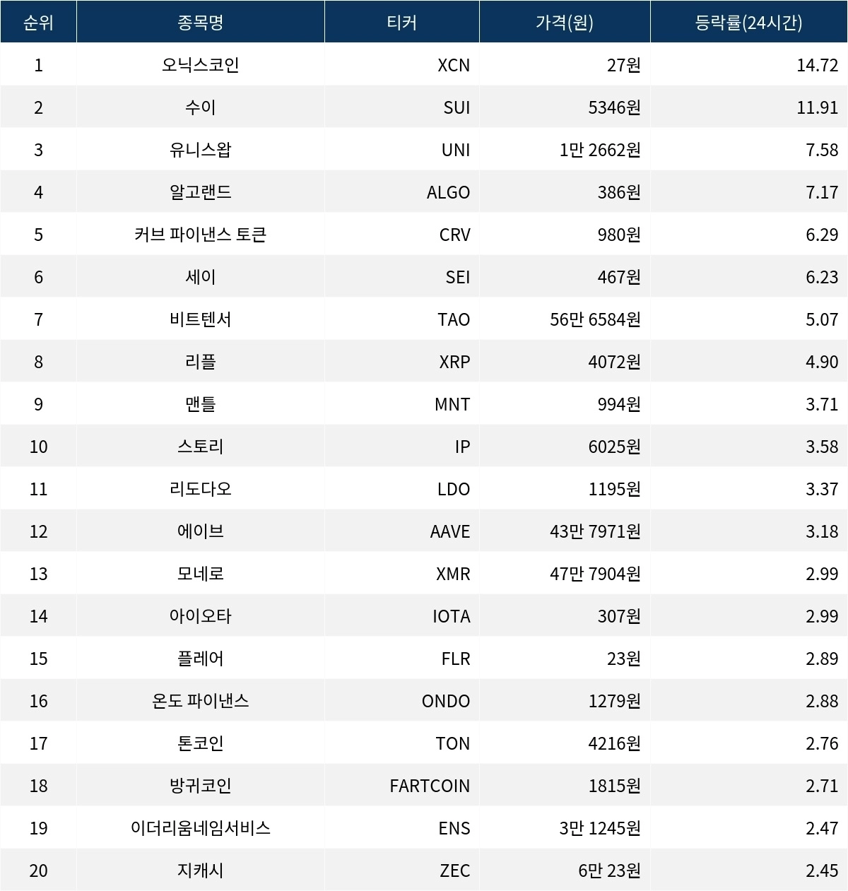 [서울데이터랩]오닉스코인·수이·유니스왑 24시간 상승률 상위