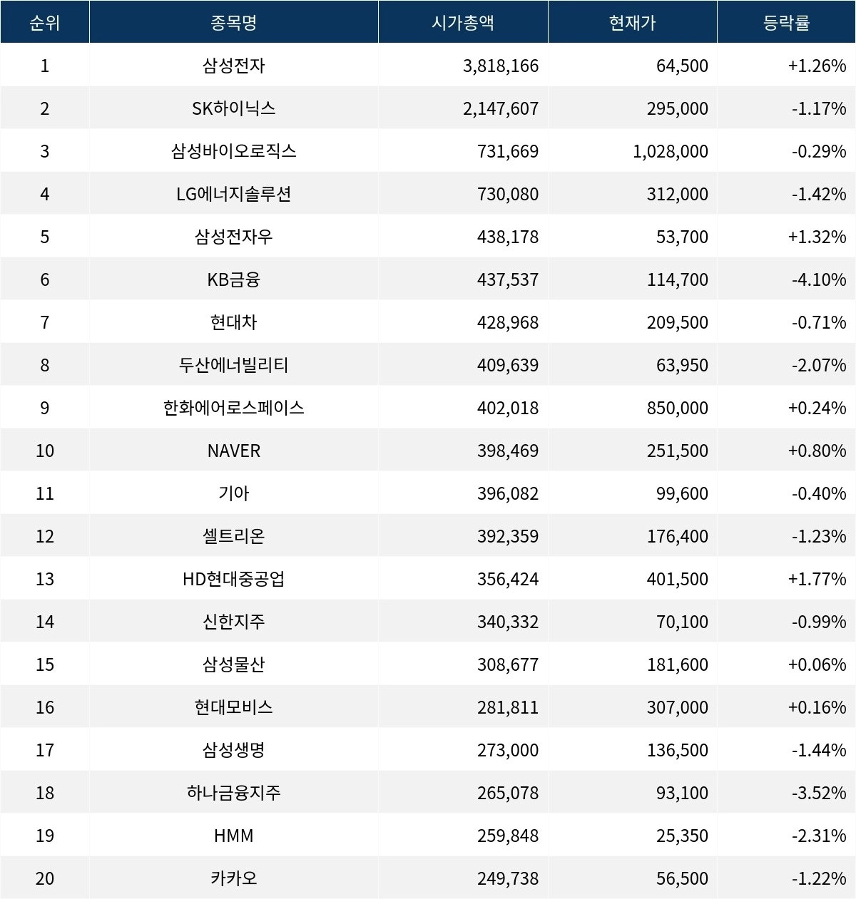 16일 오후 12시 20분 한국거래소에 따르면, 시가총액 1위 삼성전자(005930)는 현재가 64,500원으로 전 거래일 대비 1.26% 상승하고 있다. 시가총액은 3,818,166억 원이며, 외국인비율은 49.83%다. 거래량은 12,828,662주로 기록되며, PER은 12.50, ROE는 9.03으로 안정적인 재무 상태를 유지하고 있다. 반면, 시가총액 2위인 SK하이닉스(000660)는 295,000원으로 전 거래일 대비 1.17% 하락하며 약세를 보이고 있다. 이 종목의 시가총액은 2,147,607억 원이며, 외국인비율은 55.55%다. 거래량은 1,678,658주이며, PER은 8.27, ROE는 31.06이다.