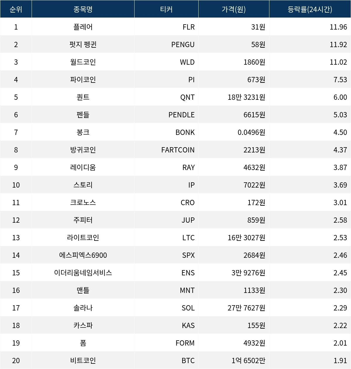 [서울데이터랩]플레어·펏지 펭귄·월드코인 24시간 상승률 상위