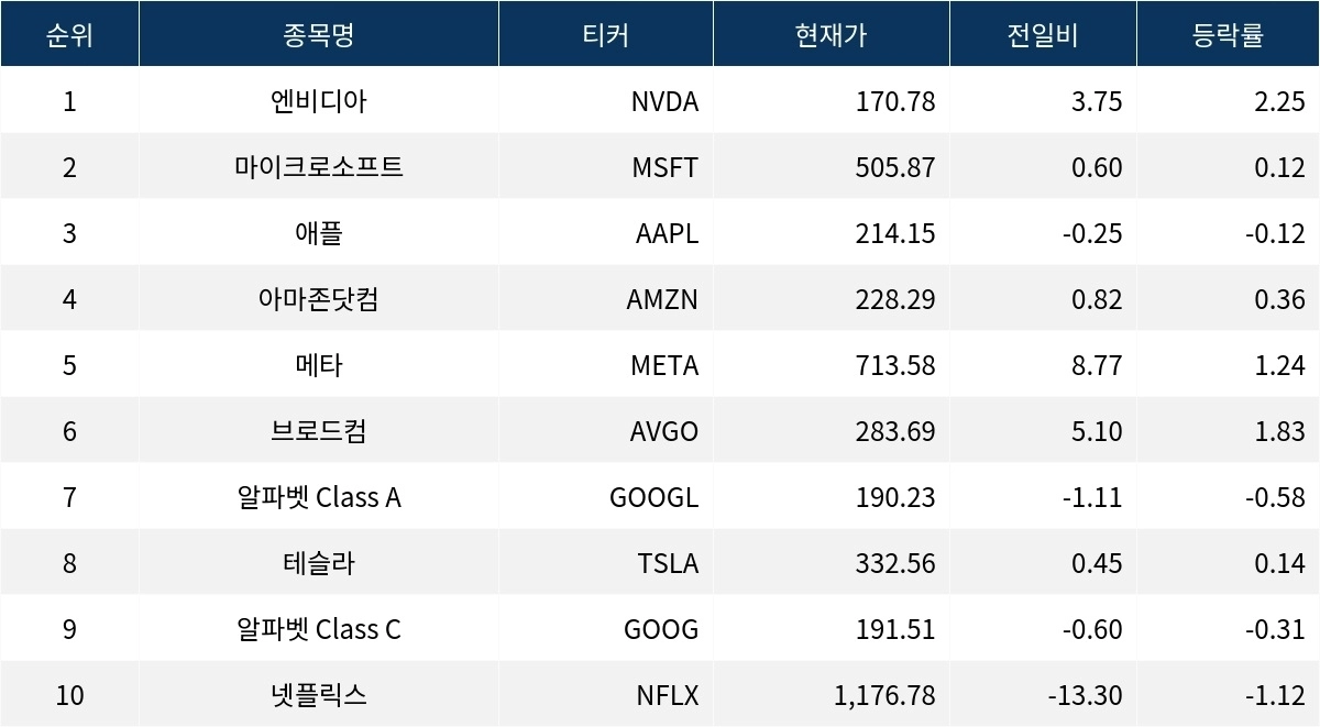 엔비디아는 170.78 달러로 2.25% 상승하며 가장 큰 폭의 상승세를 보였다. 메타는 1.24% 상승하여 713.58 달러를 기록했다. 브로드컴(AVGO) 또한 1.83% 상승하며 283.69 달러에 거래를 마쳤다.