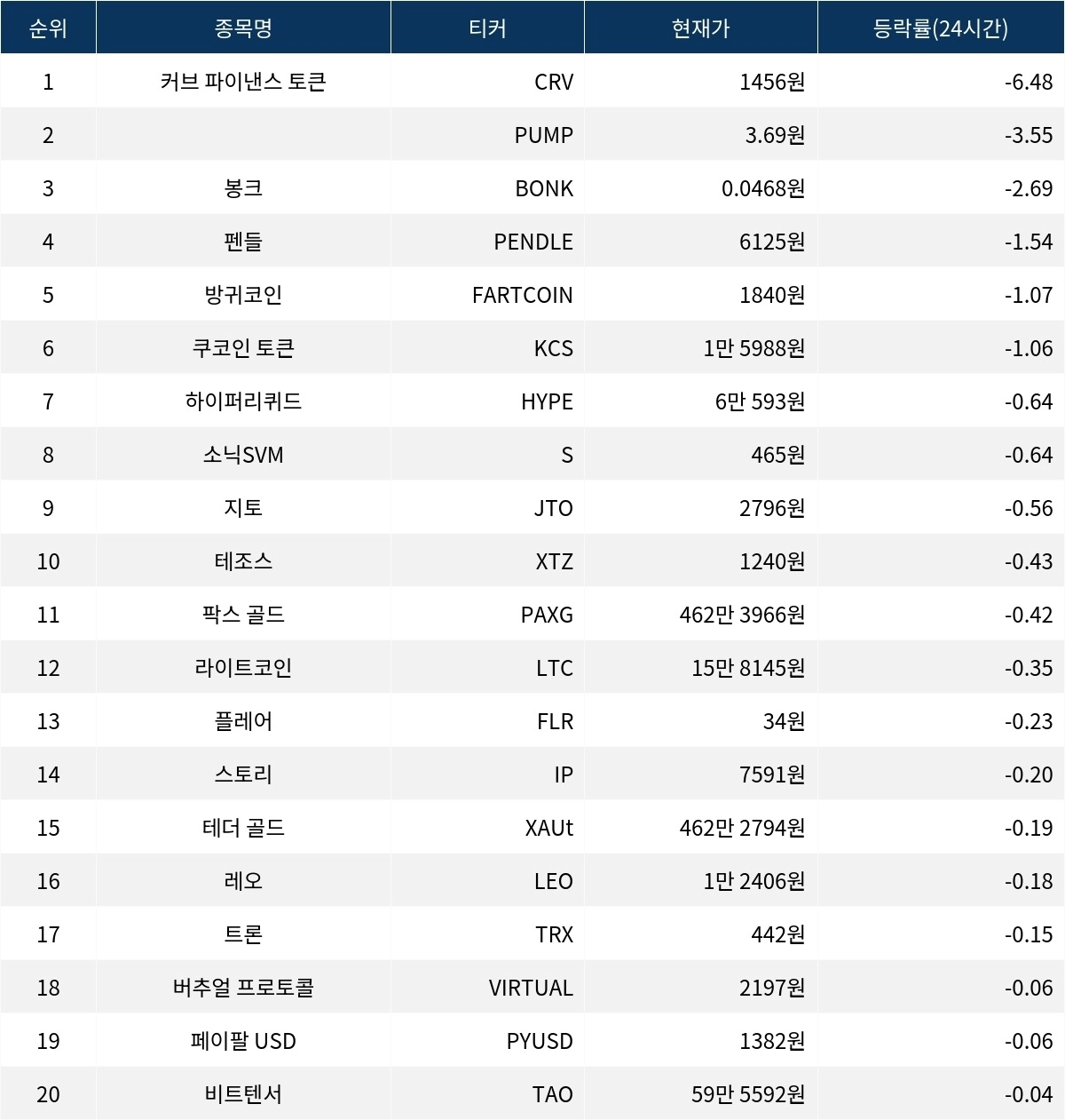 [서울데이터랩]커브 파이낸스·펌프·봉크, 24시간 하락률 상위