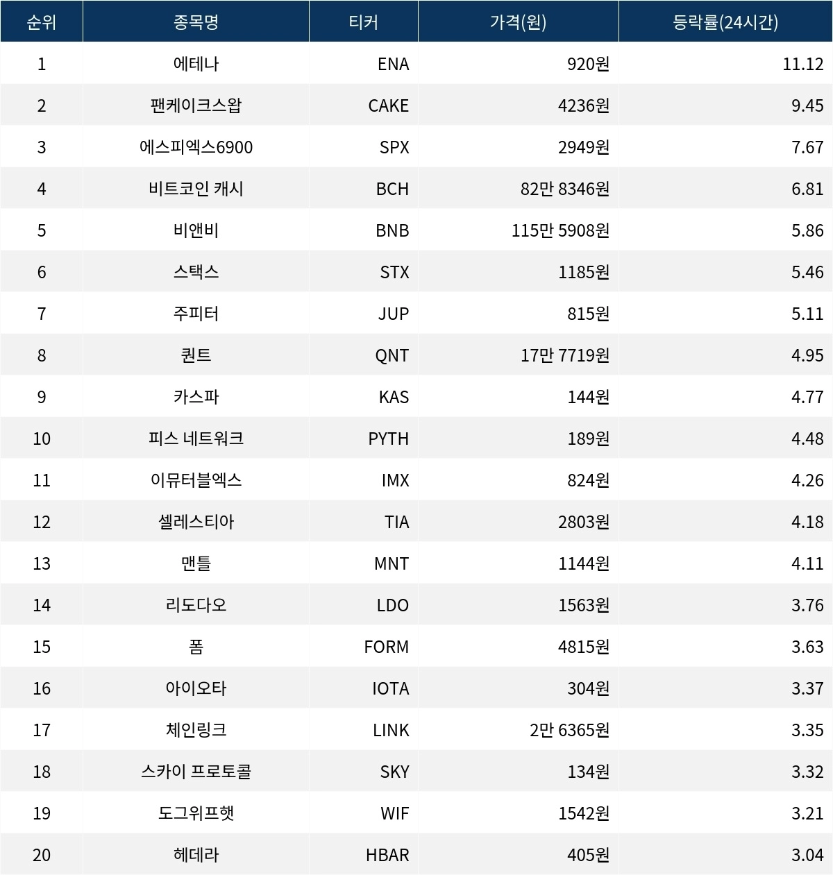 [서울데이터랩]에테나·팬케이크스왑·에스피엑스6900 24시간 상승률 상위