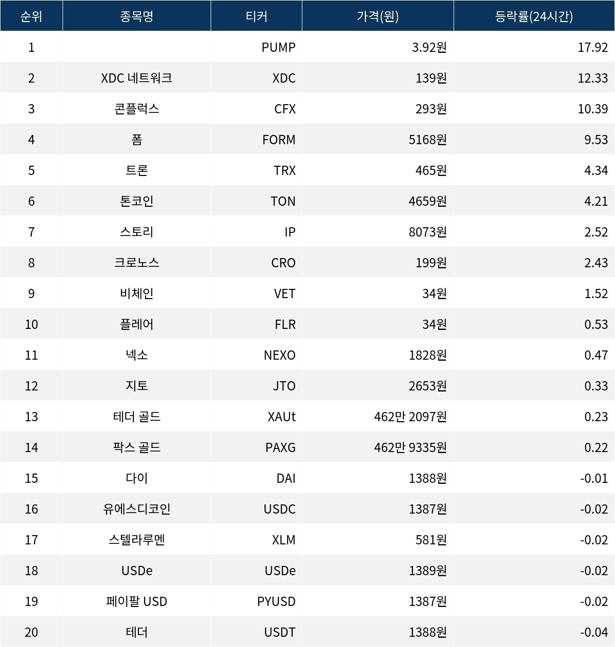 [서울데이터랩]PUMP·XDC 네트워크·콘플럭스, 24시간 상승률 상위