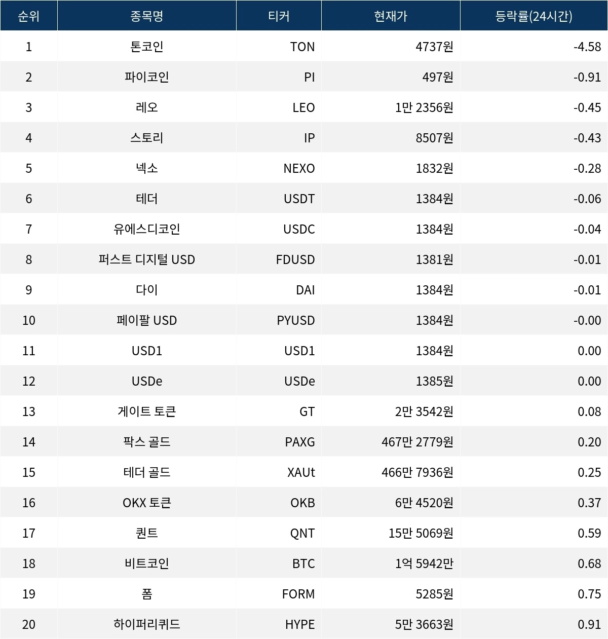 [서울데이터랩]톤코인·파이코인·레오, 24시간 하락률 상위