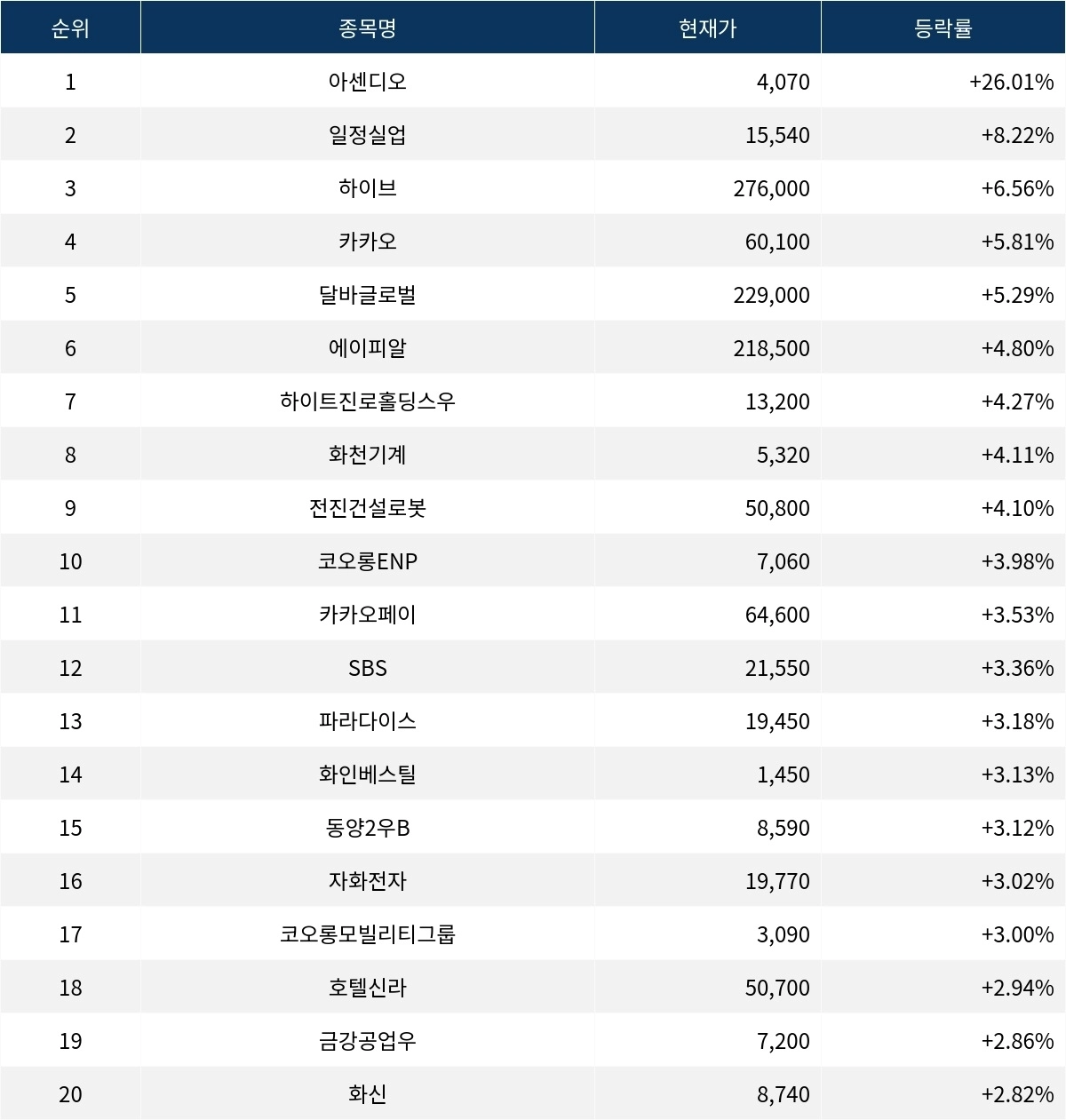 이어 상승률 2위 일정실업(008500)은 현재가 15,540원으로 주가가 8.22% 상승하고 있다. 상승률 3위 하이브(352820)는 현재 276,000원으로 6.56% 상승 중이다. 상승률 4위 카카오(035720)는 5.81% 상승하며 60,100원에 거래되고 있다. 상승률 5위 달바글로벌(483650)은 5.29%의 상승세를 보이며 229,000원에 거래되고 있다.