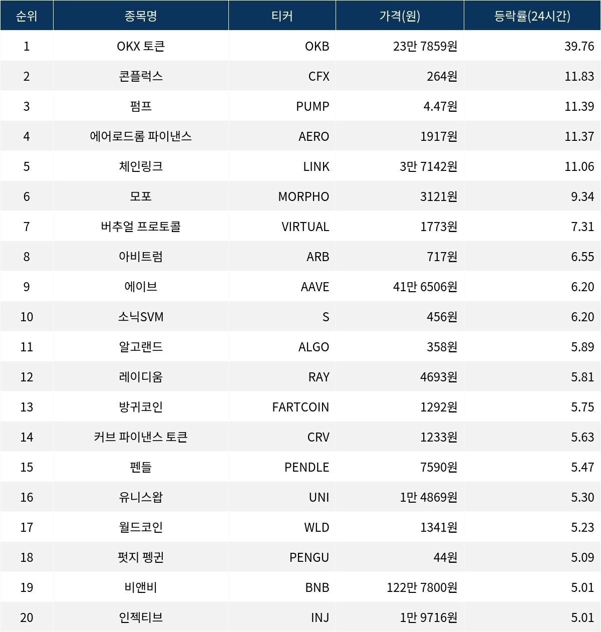 펌프(PUMP)는 11.39% 상승하며 세 번째로 높은 상승률을 기록했다. 펌프의 가격은 현재 4.47원이며, 시가총액은 약 1조 5824억 원이다. 펌프는 주로 소셜 미디어 및 콘텐츠 공유 플랫폼 내에서의 보상 시스템에 활용되는 토큰이다.