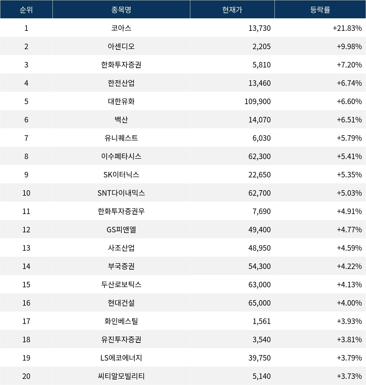 6위 백산(035150)은 현재가 14,070원으로 6.51% 상승 중이다. 7위 유니퀘스트(077500)는 현재가 6,030원으로 5.79% 상승 중이다. 8위 이수페타시스(007660)는 현재가 62,300원으로 5.41% 상승 중이다. 9위 SK이터닉스(475150)는 현재가 22,650원으로 5.35% 상승 중이다. 10위 SNT다이내믹스(003570)는 현재가 62,700원으로 5.03% 상승 중이다.