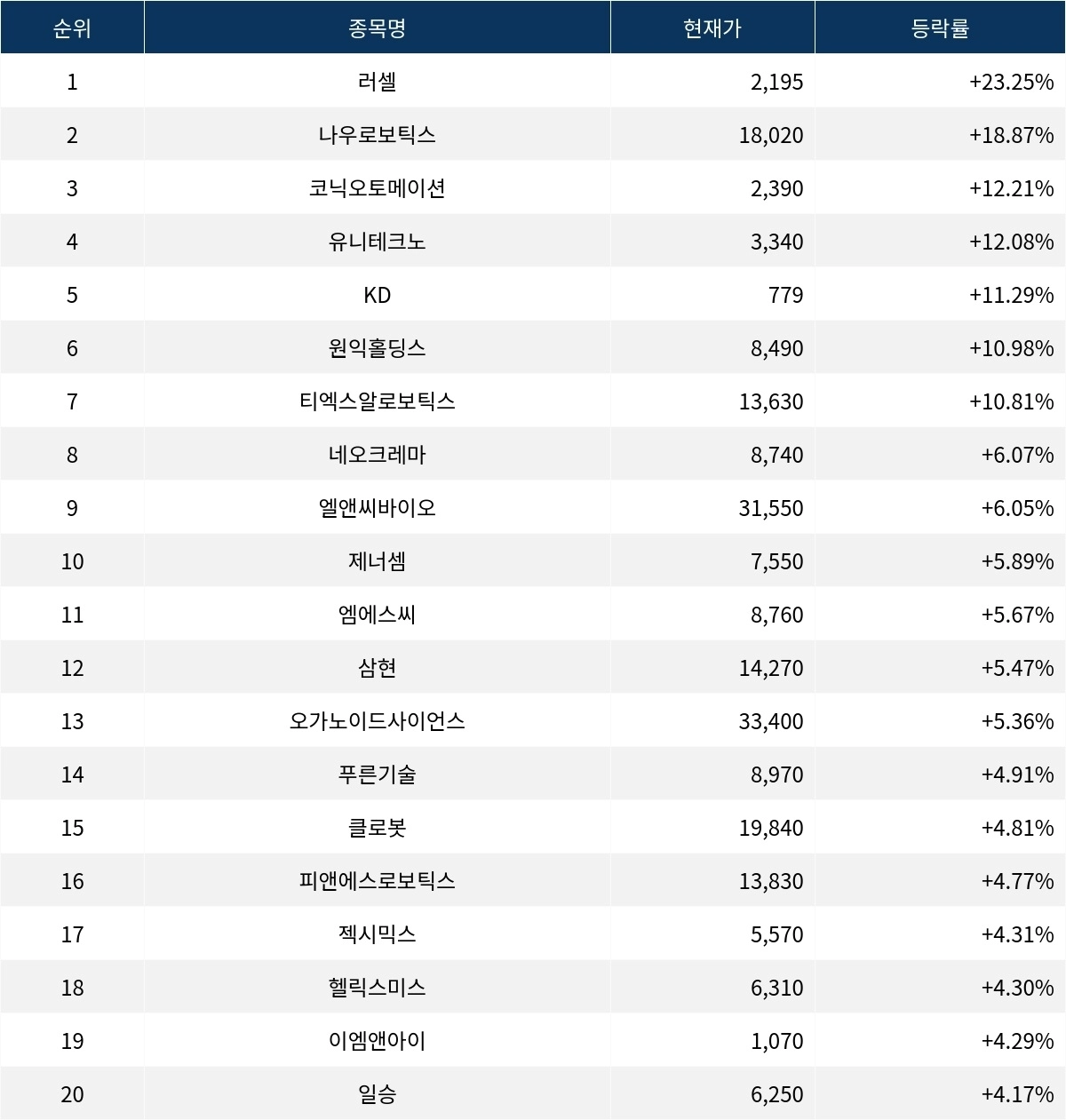 6위 원익홀딩스(030530)는 현재가 8,490원으로 10.98% 상승 중이다. 7위 티엑스알로보틱스(484810)는 현재가 13,630원으로 10.81% 상승 중이다. 8위 네오크레마(311390)는 현재가 8,740원으로 6.07% 상승 중이다. 9위 엘앤씨바이오(290650)는 현재가 31,550원으로 6.05% 상승 중이다. 10위 제너셈(217190)은 현재가 7,550원으로 5.89% 상승 중이다.