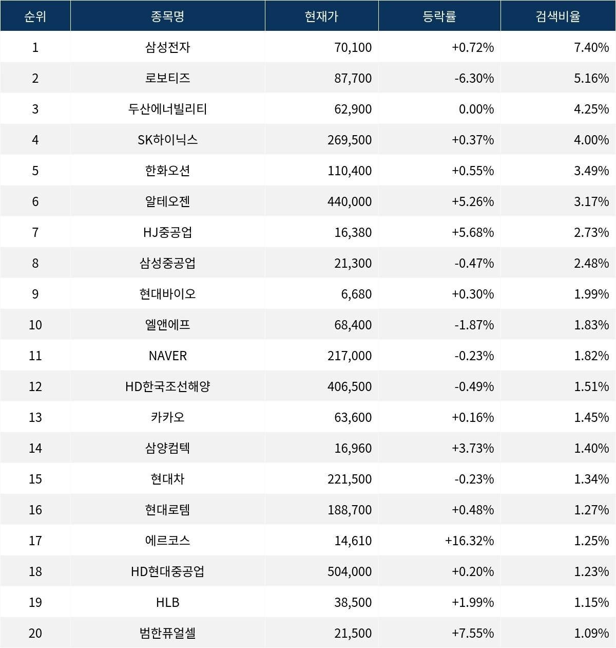 이어 로보티즈(108490)가 검색비율 2위를 기록하며 -6.30%의 하락세를 기록하고 있다. 검색비율 3위의 두산에너빌리티(034020)는 0.00%의 등락률로 보합세를 보이고 있다. 검색비율 4위 SK하이닉스(000660)는 개장 초반부터 0.37%의 상승률을 보이며 주가가 소폭 상승 중이다. 검색비율 5위 한화오션(042660)은 0.55% 상승하며 큰 움직임을 보이지 않고 있다.