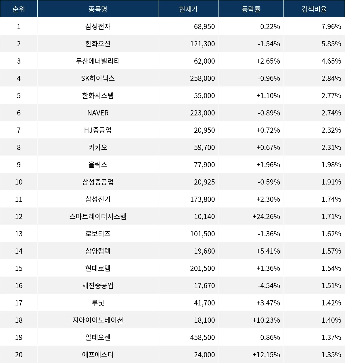 이 밖에도 스마트레이더시스템(424960) ▲24.26%, 루닛(328130) ▲3.47%, 지아이이노베이션(358570) ▲10.23%, 삼성전기(009150) ▲2.30%, 현대로템(064350) ▲1.36%, 삼양컴텍(484590) ▲5.41%, 알테오젠(196170) ▼0.86%, 에프에스티(036810) ▲12.15%, 로보티즈(108490) ▼1.36%, 세진중공업(075580) ▼4.54% 등이 많이 검색되고 있다.