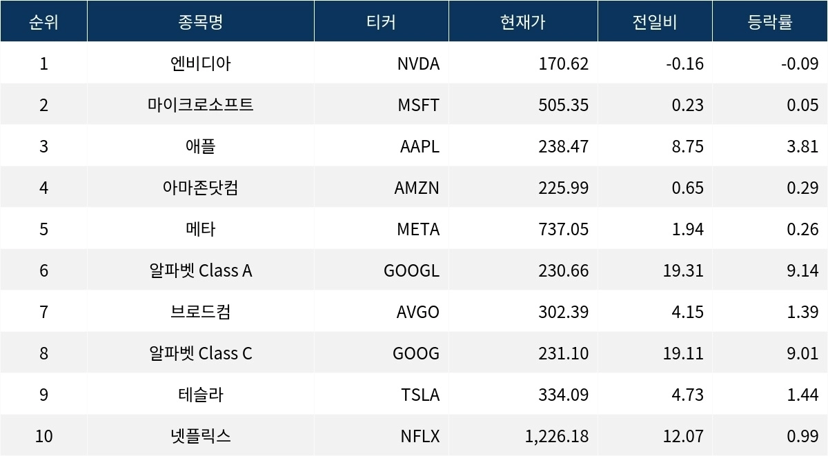 애플(AAPL)은 3.81% 상승한 238.47달러로 거래를 마쳤다. 알파벳 Class A(GOOGL)은 9.14% 상승한 230.66달러를 기록하며 강세를 보였다. 브로드컴(AVGO)은 1.39% 오른 302.39달러에 거래를 마감했다.