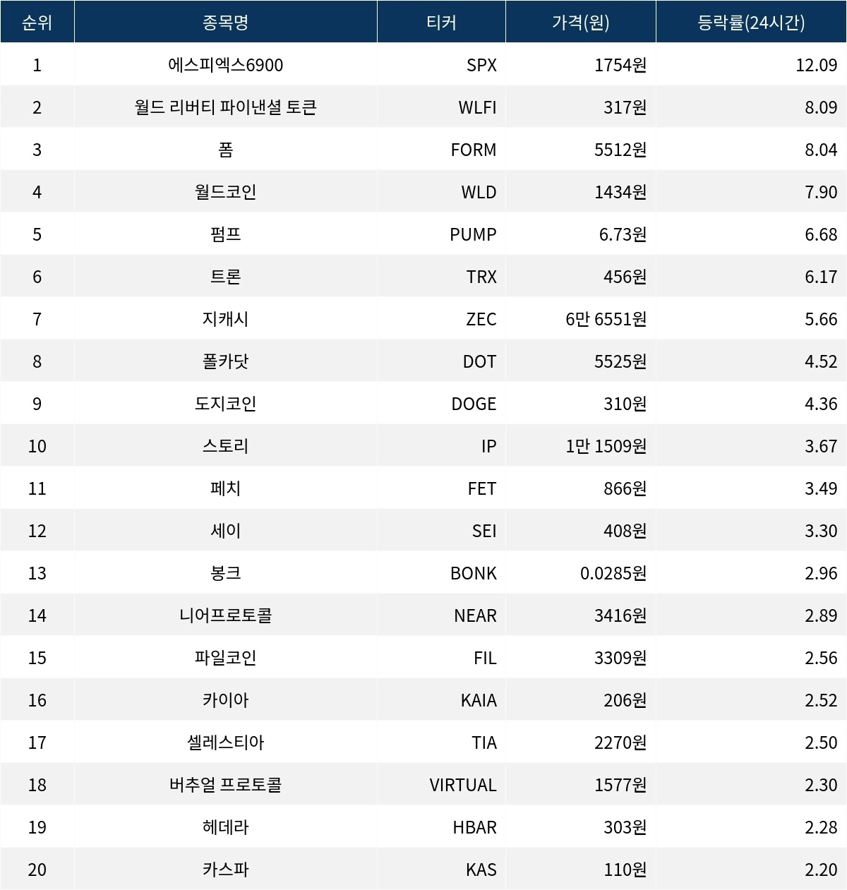 [서울데이터랩]에스피엑스6900·월드 리버티 파이낸셜 토큰·폼, 24시간 상승률 상위