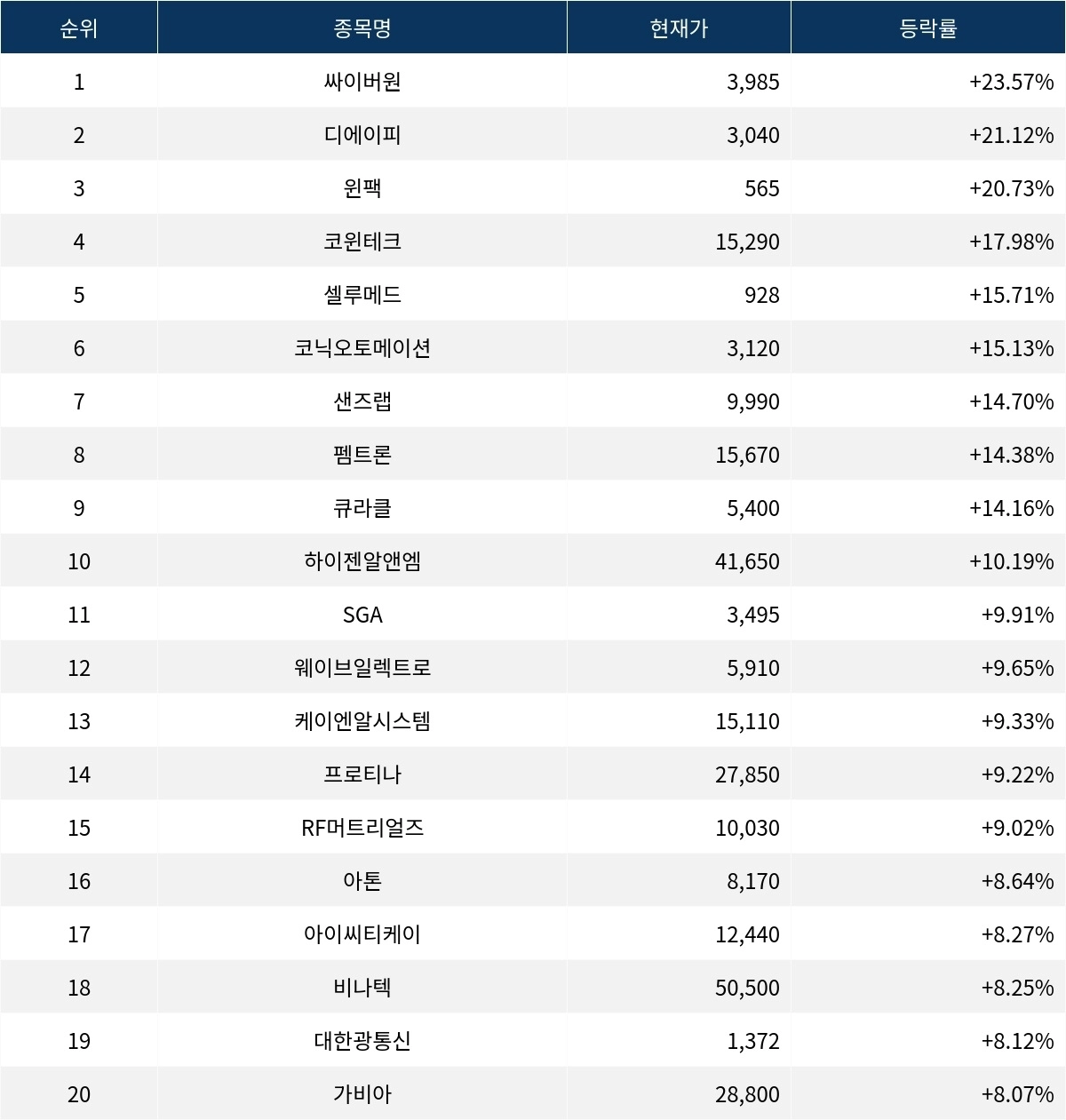 6위 코닉오토메이션(391710)은 현재가 3,120원으로 15.13% 상승 중이다. 7위 샌즈랩(411080)은 현재가 9,990원으로 14.70% 상승 중이다. 8위 펨트론(168360)은 현재가 15,670원으로 14.38% 상승 중이다. 9위 큐라클(365270)은 현재가 5,400원으로 14.16% 상승 중이다. 10위 하이젠알앤엠(160190)은 현재가 41,650원으로 10.19% 상승 중이다.