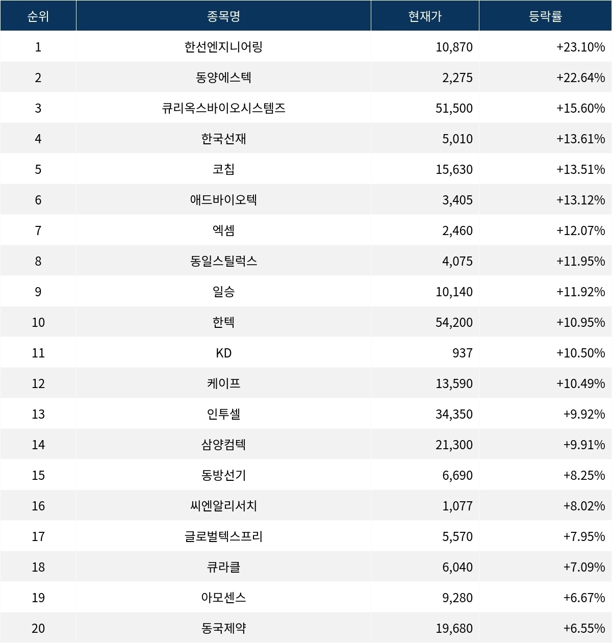 6위 애드바이오텍(179530)은 현재가 3,405원으로 13.12% 급등 중이다. 7위 엑셈(205100)은 현재가 2,460원으로 12.07% 급등 중이다. 8위 동일스틸럭스(023790)는 현재가 4,075원으로 11.95% 급등 중이다. 9위 일승(333430)은 현재가 10,140원으로 11.92% 급등 중이다. 10위 한텍(098070)은 현재가 54,200원으로 10.95% 상승 중이다.