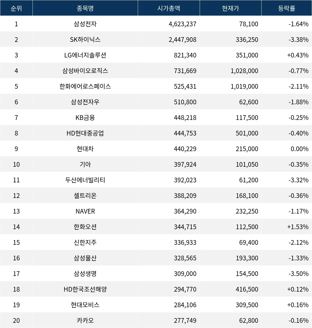 한편 시가총액 20위권 종목들은 두산에너빌리티(034020) ▼3.32%, 셀트리온(068270) ▼0.36%, NAVER(035420) ▼1.17%, 한화오션(042660) ▲1.53%, 신한지주(055550) ▼2.12%, 삼성물산(028260) ▼1.33%, 삼성생명(032830) ▼3.50%, HD한국조선해양(009540) ▲0.12%, 현대모비스(012330) ▲0.16%, 카카오(035720) ▼0.16% 등의 성적을 기록하고 있다.
