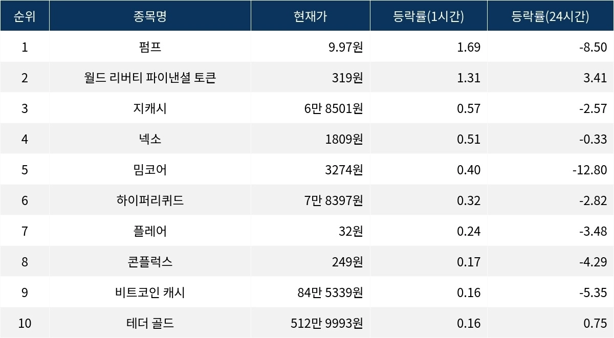 [서울데이터랩]펌프 월드 리버티 파이낸셜 토큰 지캐시, 1시간 상승률 상위