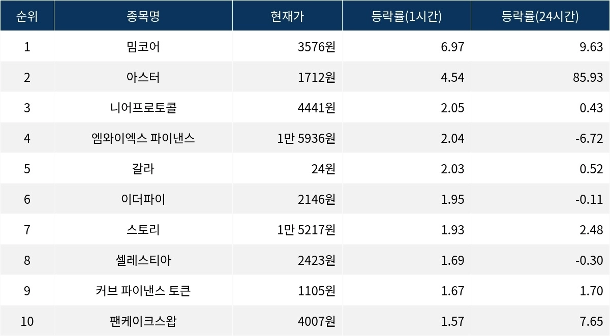 [서울데이터랩]밈코어 아스터 니어프로토콜, 1시간 상승률 상위