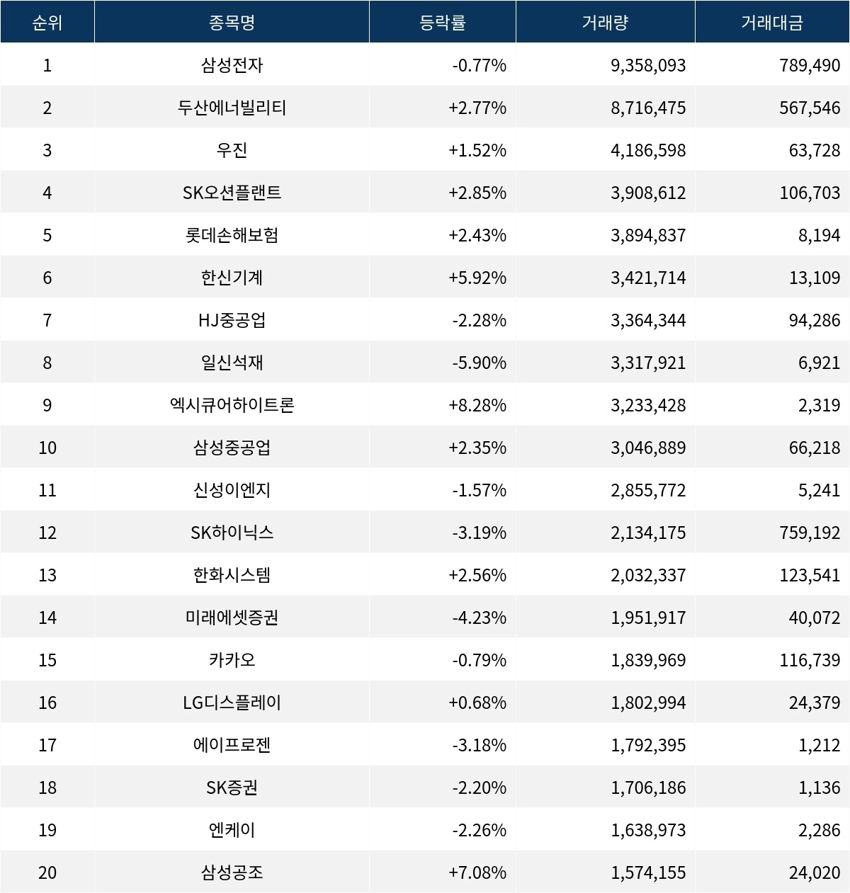한편 거래량 상위 20위권 종목들은 신성이엔지(011930) ▼1.57%, SK하이닉스(000660) ▼3.19%, 한화시스템(272210) ▲2.56%, 미래에셋증권(006800) ▼4.23%, 카카오(035720) ▼0.79%, LG디스플레이(034220) ▲0.68%, 에이프로젠(007460) ▼3.18%, SK증권(001510) ▼2.20%, 엔케이(085310) ▼2.26%, 삼성공조(006660) ▲7.08% 등의 성적을 기록했다.