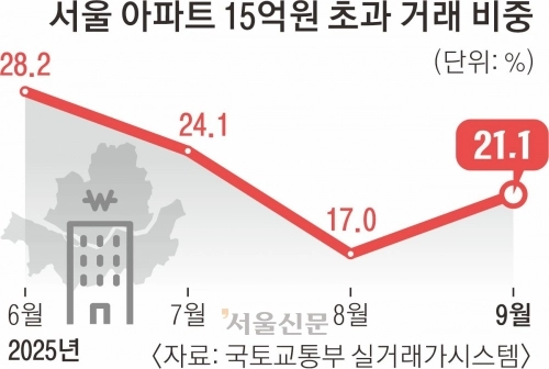 서울 아파트 시장은 주택담보대출 한도를 6억원으로 제한한 6·27 대출 규제 이후 거래량이 크게 줄어든 가운데, 상대적으로 고가 아파트의 감소 추세가 두드러졌다. 지난 6월 28.2%였던 15억원 초과 거래 비중은 7월에 24.1%로 줄었고, 8월에는 17.0%로 감소했으나 9월 들어 다시 20%를 넘긴 것이다.