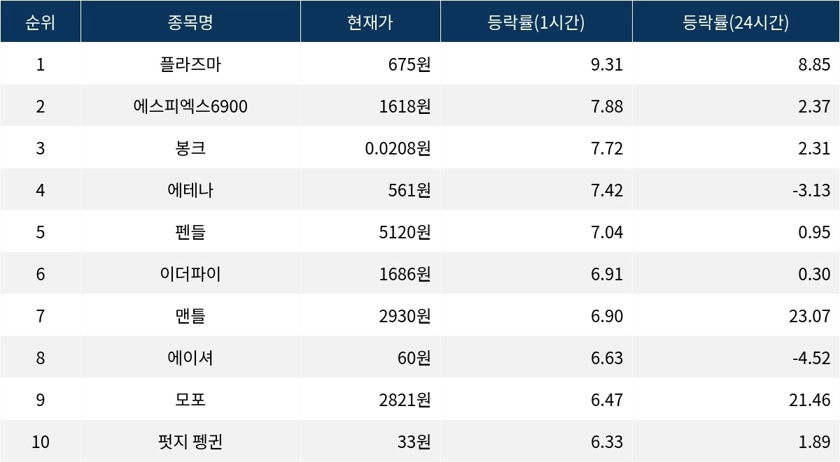 [서울데이터랩]플라즈마·에스피엑스6900·봉크, 1시간 상승률 상위