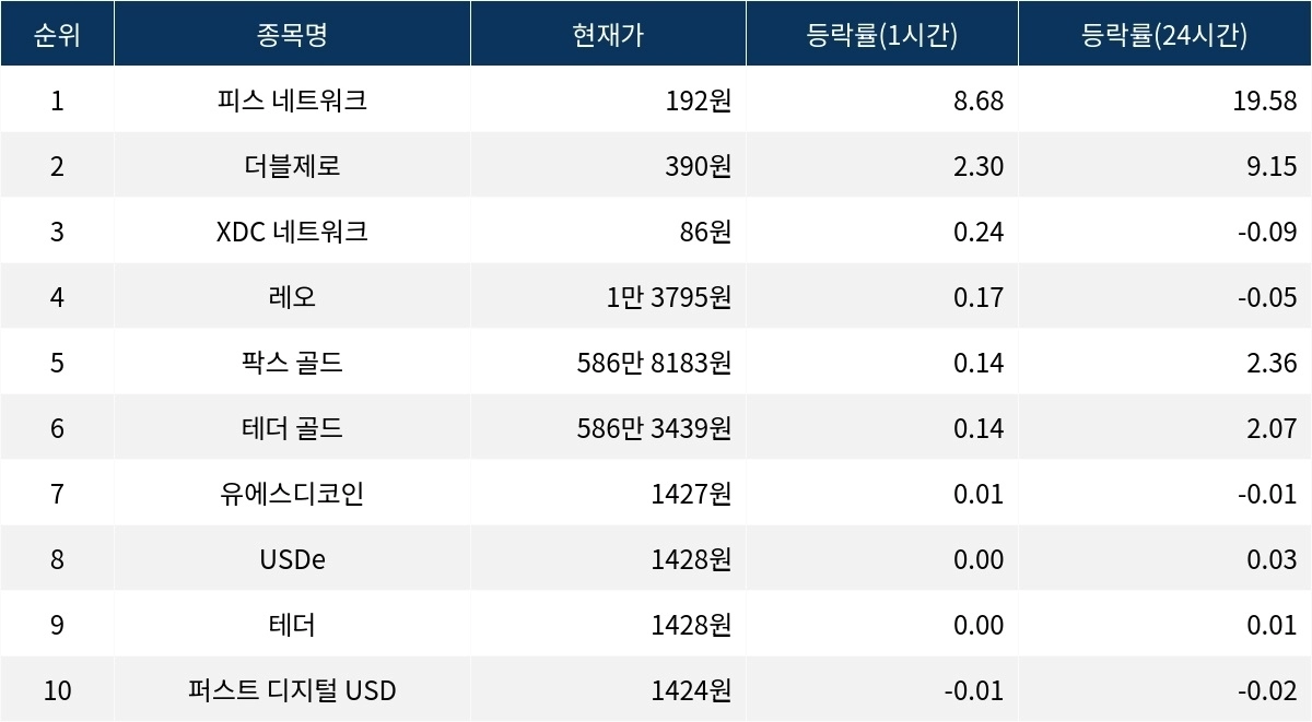 [서울데이터랩]피스 네트워크 더블제로 XDC 네트워크 1시간 상승률 상위